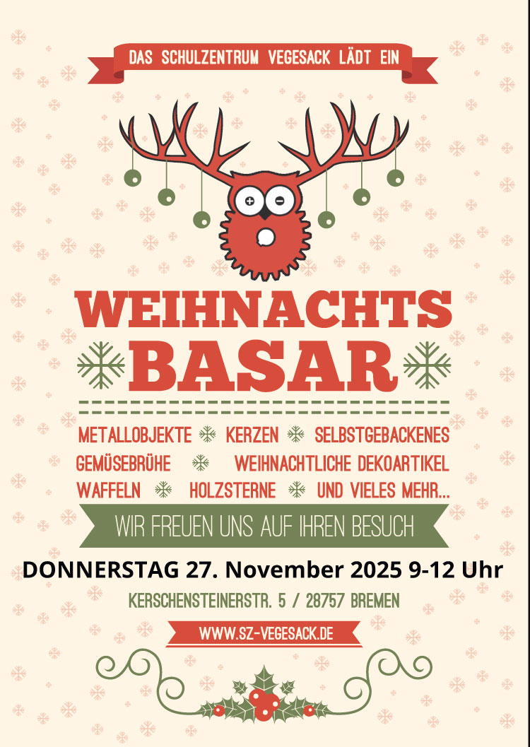 Das Schulzentrum Vegesack lädt am Donnerstag, den 27. November 2025 in der Zeit von 9 bis 12 Uhr zum alljährlichen Weihnachtsbasar ein.